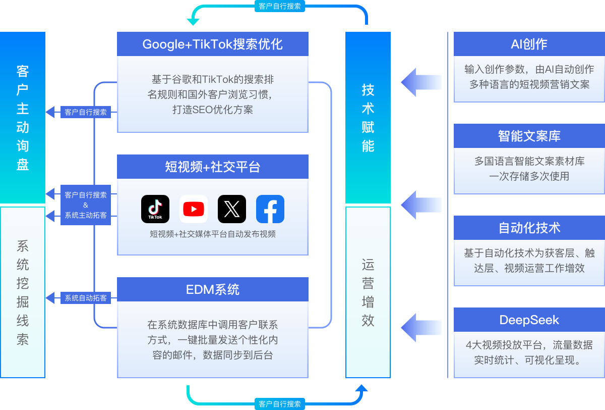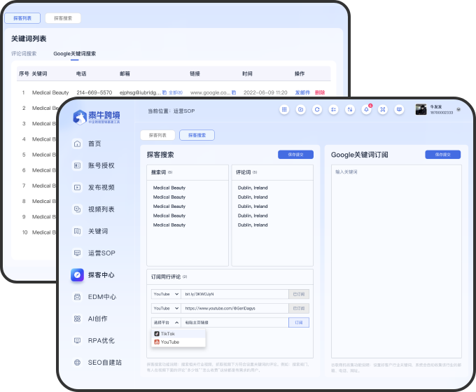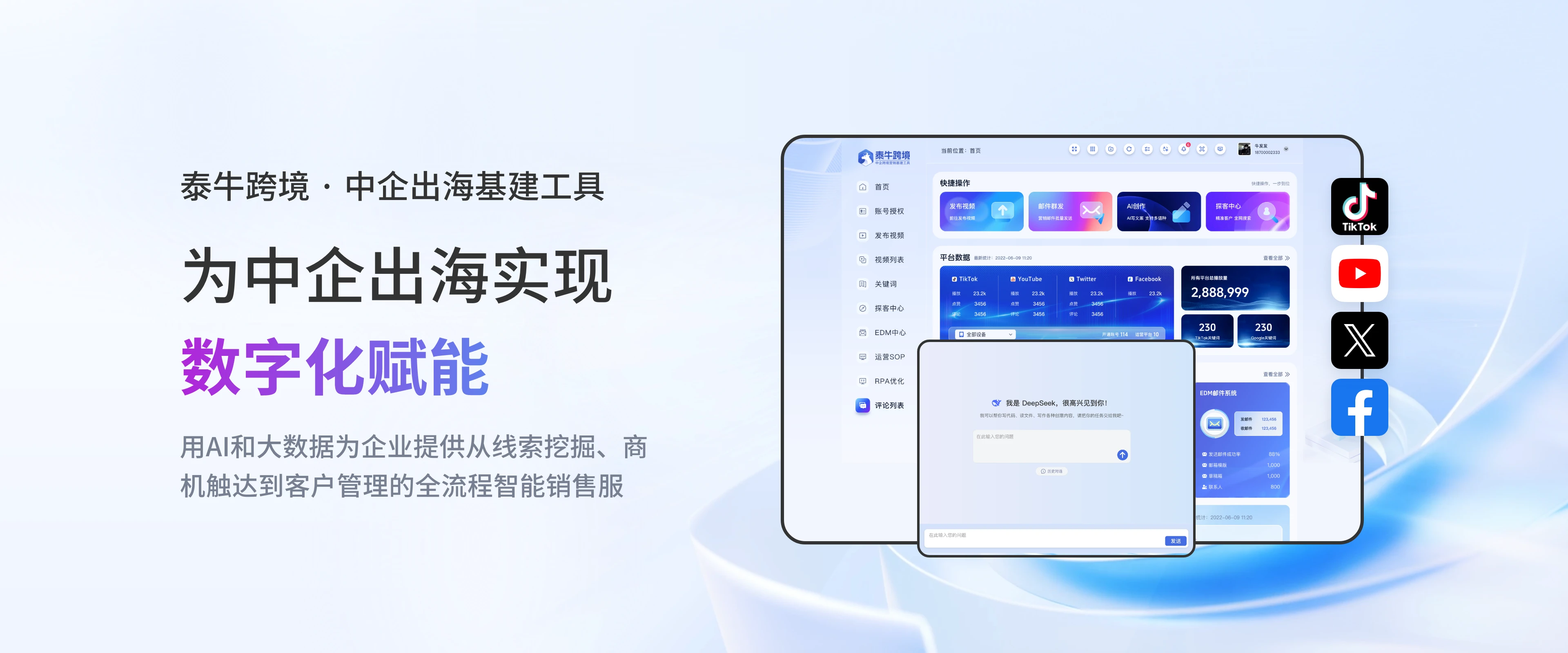 泰牛跨境是以领先的搜索引擎优化技术、人工智能技术、全球8大语种翻译技术、多渠道营销推广技术、买家大数据挖掘技术,帮助外贸企业通过多语言、多关键词、多搜索引擎、多渠道推广的模式整合,为企业提供高效的一站式外贸营销解决方案。